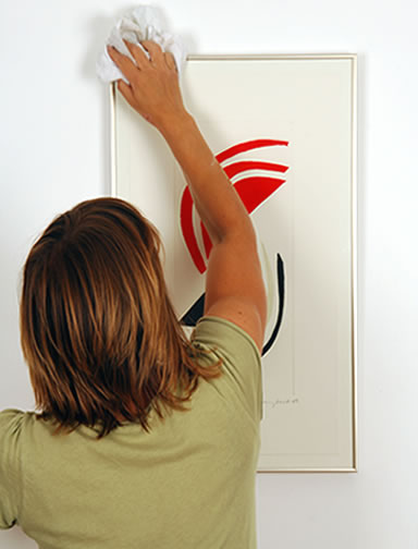 To avoid damaging the finish, care should be taken when cleaning a frame. This is crucial when cleaning gilded frames, which should be lightly dusted with a lint free cloth. When cleaning the glass, no water or cleaning fluid should be allowed to migrate behind the glazing.